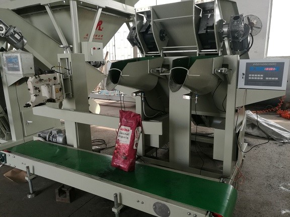Auto feeding-->auto weighing and fill into the weighing bucket--> manual place the bags and dump the bucket-->Filled bags onto conveyor to seal or sew the bags --> one bag finished ,next round